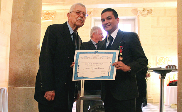 Reconhecido pelo enfrentamento a essas e outras questões e pelo resgate do republicanismo no Brasil, o advogado e presidente nacional do PRB, Marcos Pereira, recebeu hoje (15), em Paris, a ‘Médaille de Vermeil’ (Medalha Prata e Dourada), comenda oferecida pela ‘Société d’Encouragement au Progrès’ (Sociedade do Encorajamento ao Progresso) sob indicação da delegada da entidade no Brasil, Eliana Ovalle. A solenidade ocorreu na École Militaire (Escola Militar), fundada pelo rei Luís XV e localizada em frente à Torre Eiffel. Cerca de 150 pessoas de vários países também participaram, entre elas a deputada federal Rosangela Gomes (PRB/RJ), homenageada pelo trabalho em defesa das mulheres e dos negros. A honraria foi entregue pelo presidente da SEP, Mr. Pierre Chanoine-Martiel.