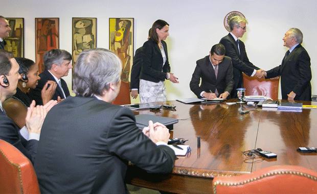 O ministro Marcos Pereira e o CEO global da SAP, Bill McDermott, assinaram nesta quinta-feira, em cerimônia no Palácio do Planalto, com a presença do presidente Michel Temer, acordo para estimular o desenvolvimento de startups.